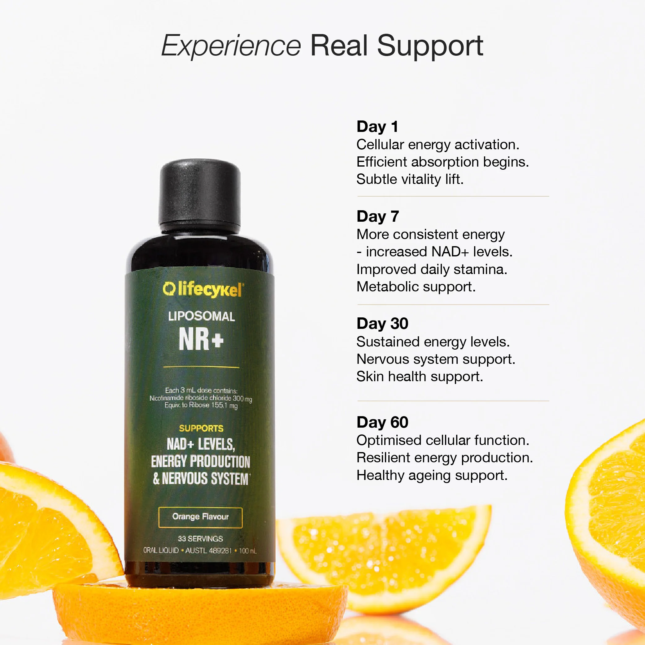 Liposomal NR+ supports cellular energy production and healthy cellular function. It helps maintain nervous system health, supports skin health and assists in maintaining cellular resilience.